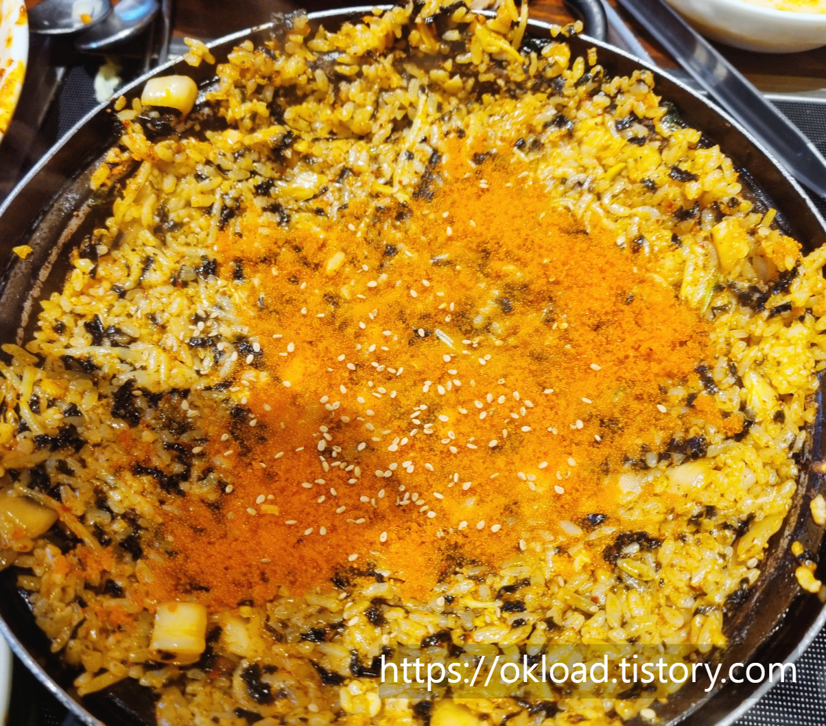 매콤한 맛이 강했던 아귀찜에 비해 볶음밥은 매운맛이 약하면서 고소한 감칠맛이라 아이들도 잘 먹습니다.