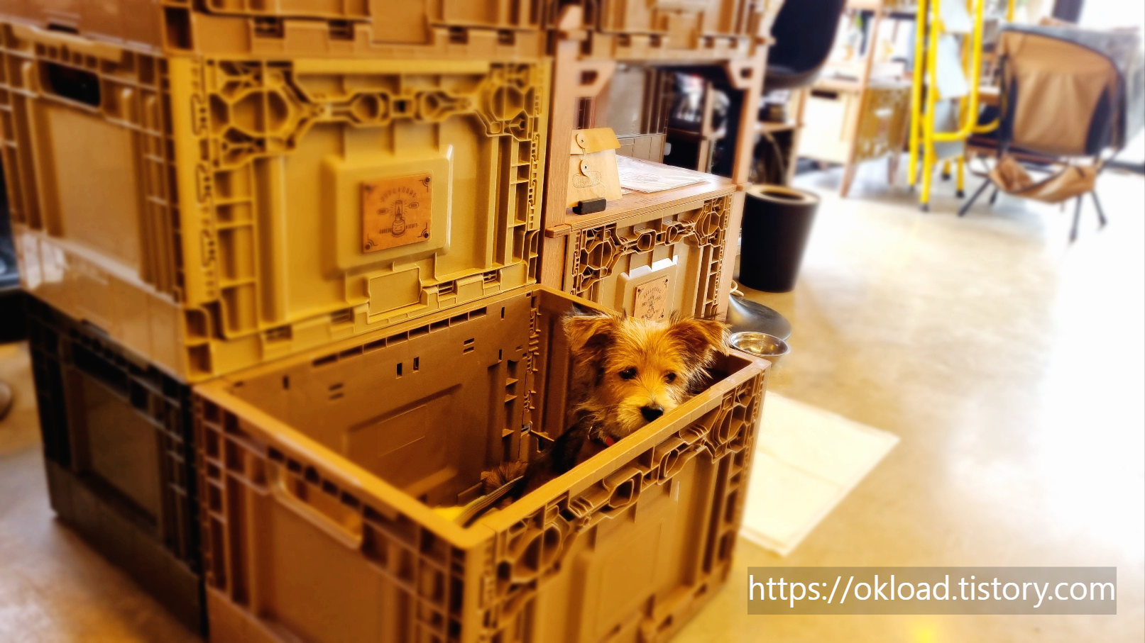 퓨파 캠프 카페 안에 이렇게 소형견이 박스 안에 있다.