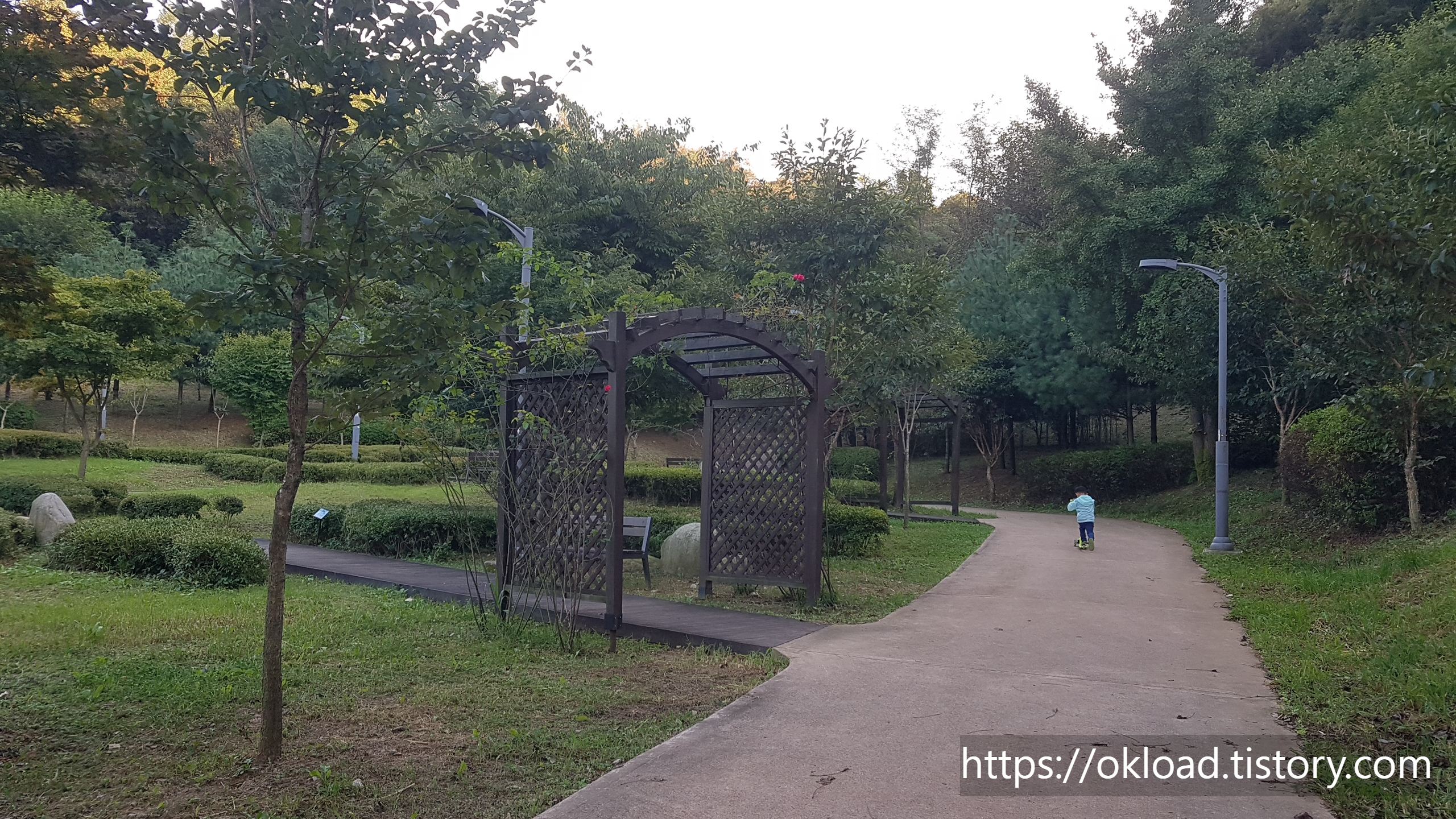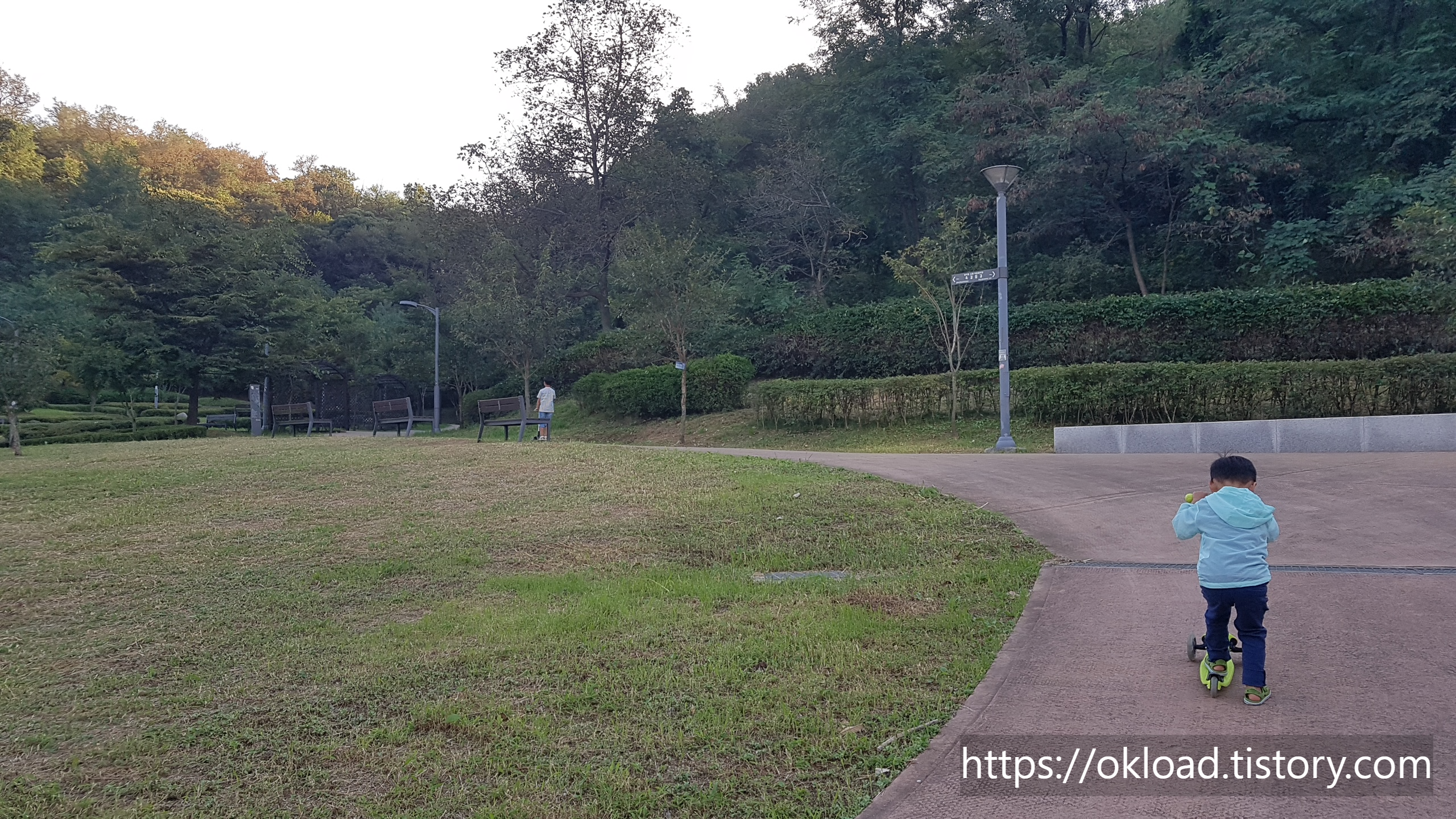 옥길 근린공원에서 버들공원으로 이어지는 보행로는 완만한 경사와 다소 가파른 경사로가 적절한 게 조화를 이루면서 아이들이 익사이팅한 코스로 킥보드를 탈 수 있다.