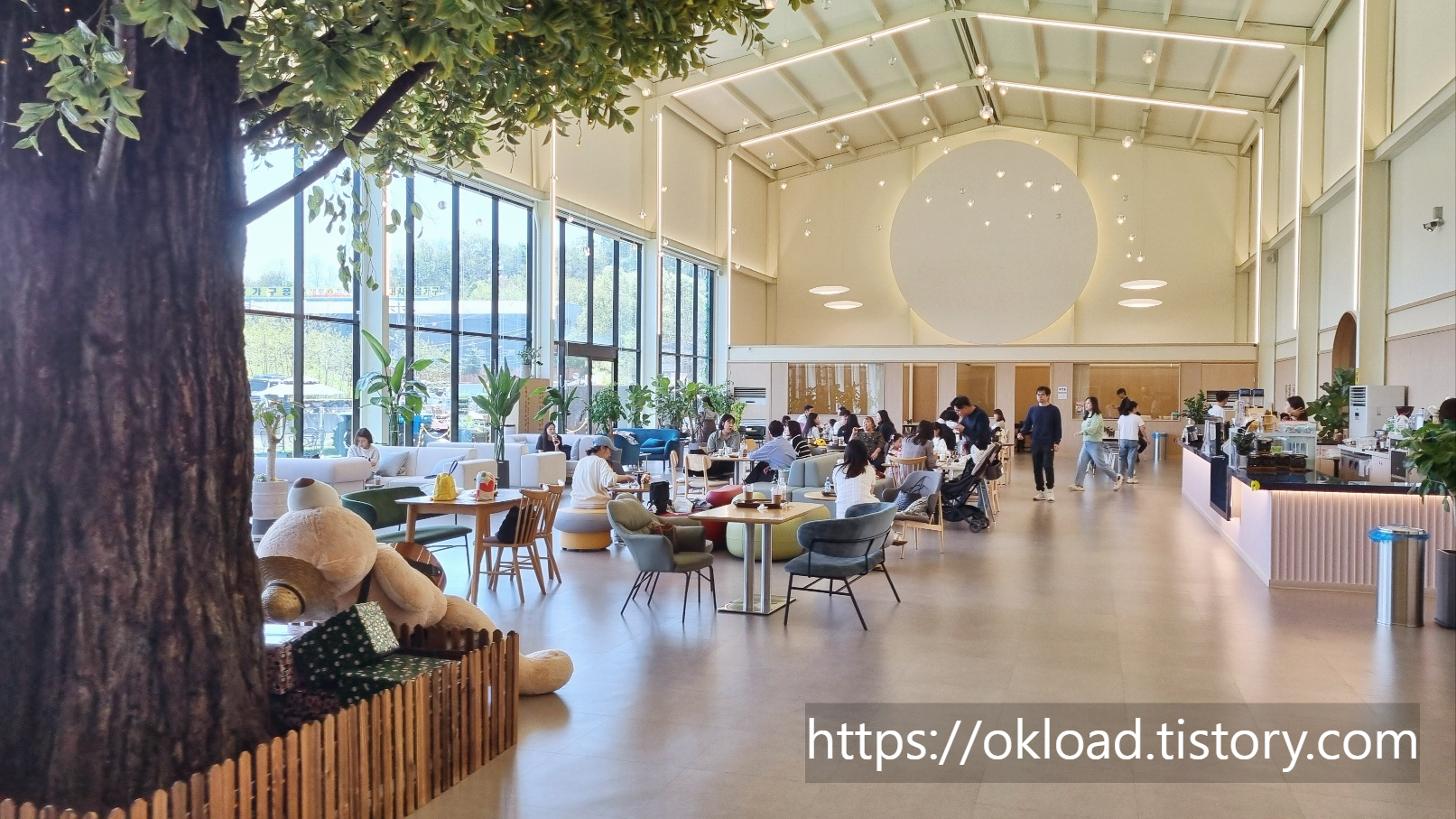 초록색 잎으로 덮인 것처럼 보이는 초대형 카페 건물이 게으른농부 체험장 키즈카페입니다.