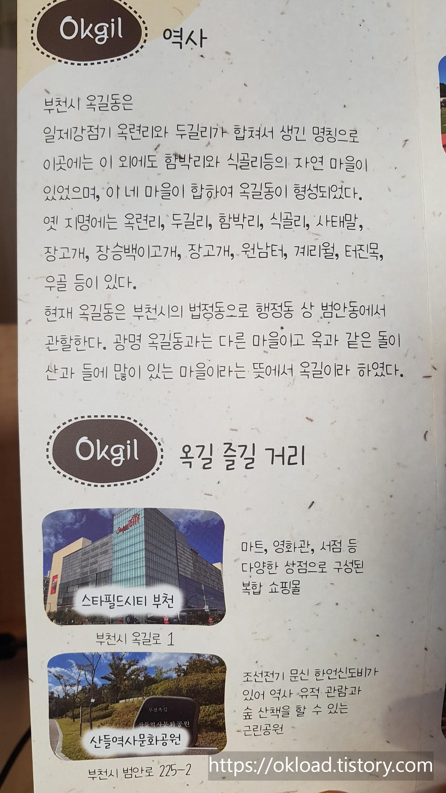 평소 즐겨찾는 카페에서 발견한 부천옥길 추천 여행지를 소개하는 팜플릿이다. 미니신도시라 불리는 작은 동네임에도 몰랐었던 여행코스나, 맛집들에 대한 소개가 담겨있었다. 안내지의 제목은 옥길여행 올댓옥길(All That Okgil)으로, 경기도평생교육진흥원, 청소년옥길마을탐험대, 로뎀문화센터의 협찬 또는 지원으로 제작된거 같다. 자연친화도시로 불리우는 경기 부천 옥길지구의 여행지를 소개한다.