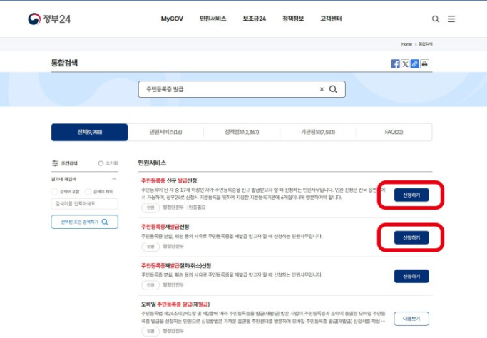 정부24 사이트 로그인을 마쳤다면, '주민등록증 발급'을 검색하여 해당 신청하기를 클릭합니다!