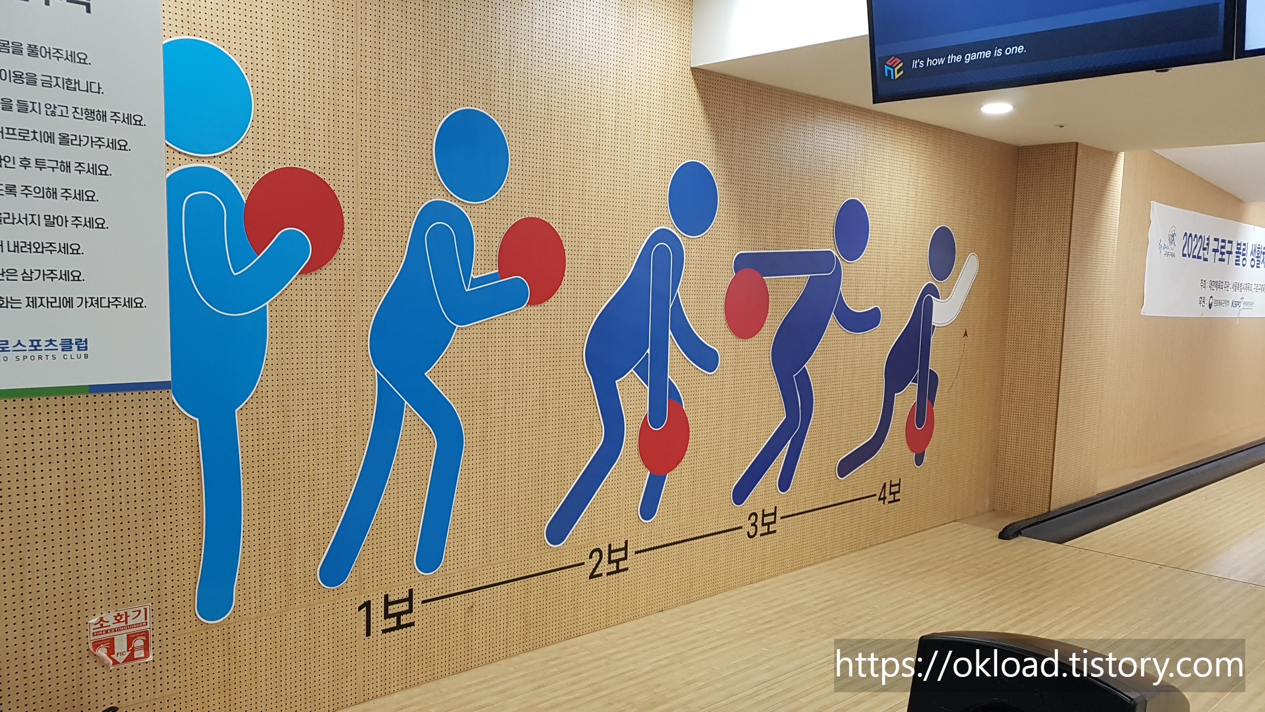 항동생활체육관 볼링장에서 볼링을 시작하기 전에 미리 몸을 풀 겸 쉐도우 스윙 연습을 해본다. 친절하게 1번 레인 옆 벽면에는 볼링 기본자세와 스텝이 그림으로 설명되어 있다.