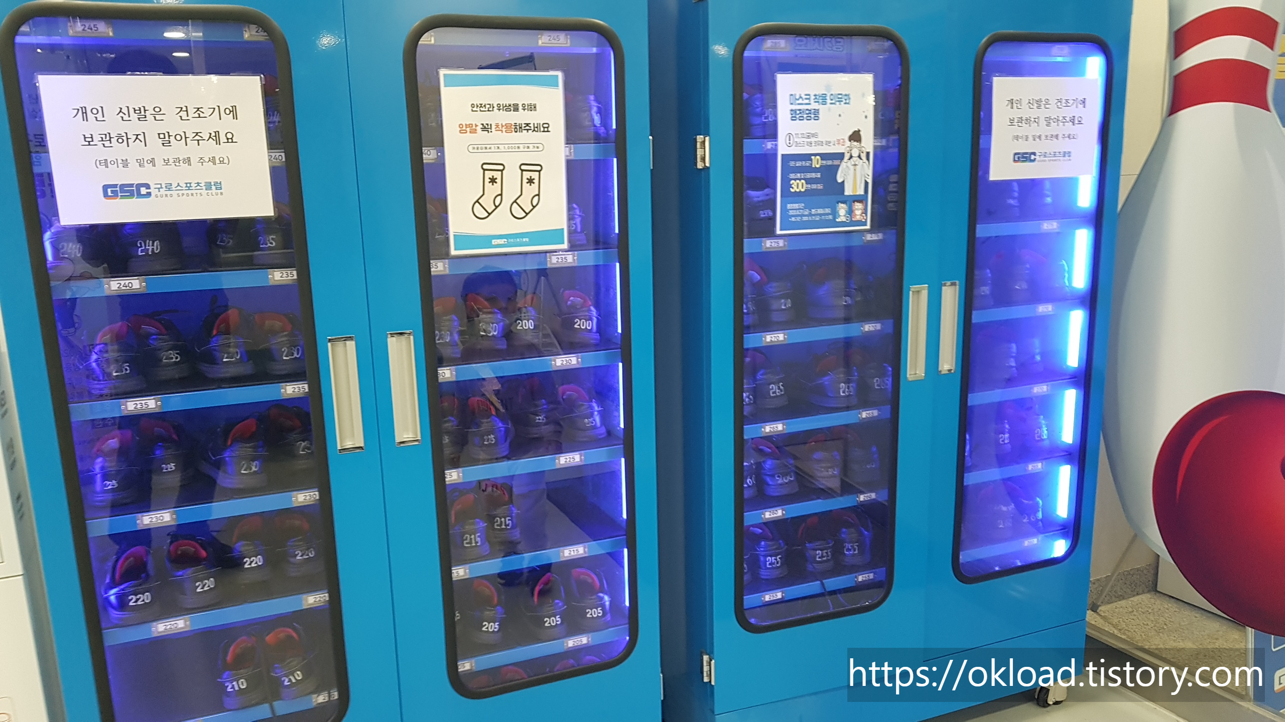 볼링화 대여료는 1천 원이고, 신발 소독기(건조기) 안에서 발 사이즈에 맞는 볼링화를 꺼내서 착용하면 된다. 볼링장 이용자들이 운동을 열심히 했는지 볼링장 운영기간에 비해 볼링화 상태가 좋지 않았다.