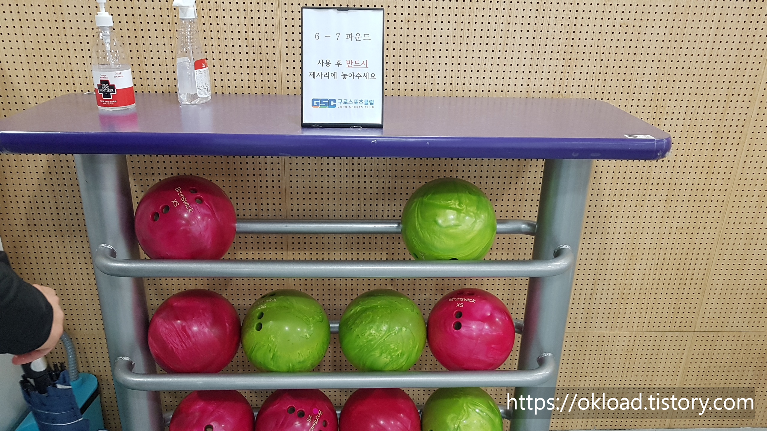 항동생활체육관 볼링장은 최신식 생활체육형 볼링잡답게 자랑거리가 많지만, 나는 단연 유아용 볼링공이 넉넉하게 준비되어 있다는 점이 마음에 들었다. 유아 및 어린이용 볼링공은 6파운드, 7파운드가 있으며 일반적인 볼링공과 다르게 타공 구멍이 4개 또는 6개 있다.