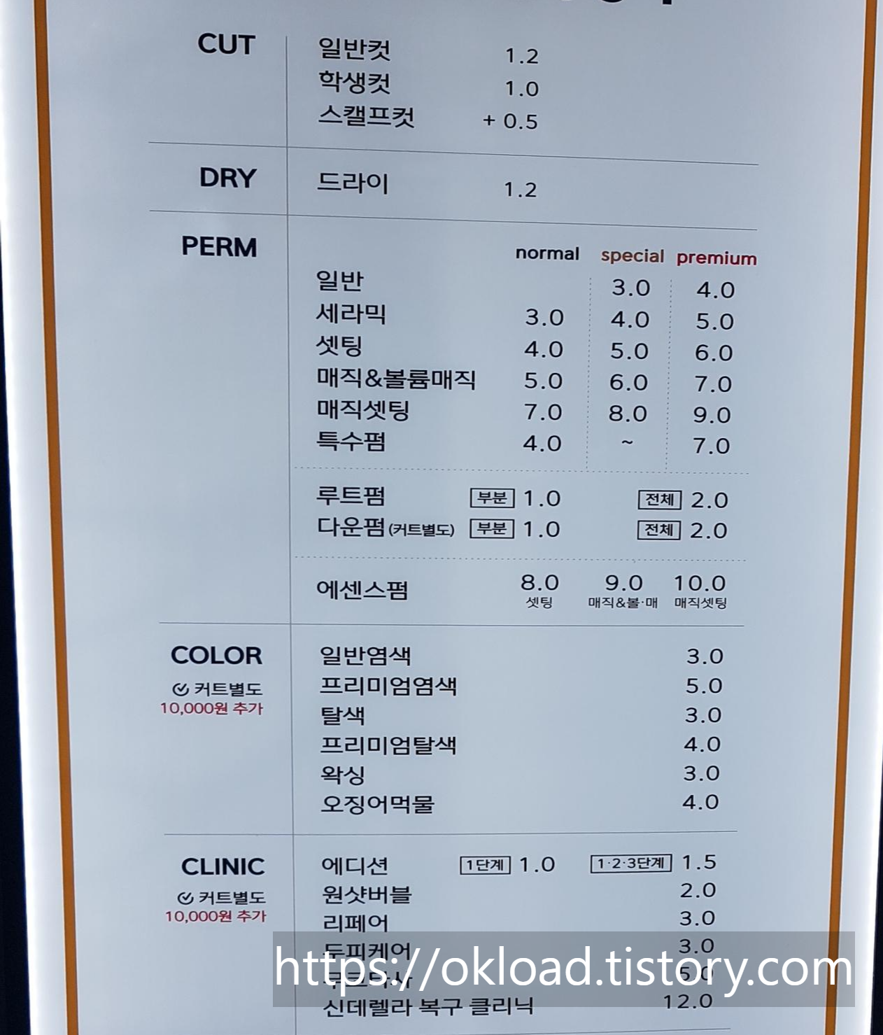 내가 이용하는 항목은 딱 두가지다. 커트(12,000원)와 다운펌(부분 1만 원, 전체 2만 원)이다. 요즘 동네의 작은 미용실을 가봐도 최소 12,000원이다. 동네 소형 미용실을 무시하는 것은 아니지만, 규모의 경제 때문이지 몰라도 대체적은 비슷한 가격이면 직원이 많고 큰 미용실의 서비스와 실력이 더 나은 경우가 많았다.