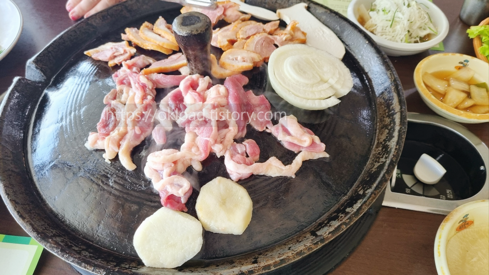 점심특선 정식은 오리훈제, 오리생고기, 오리주물럭 3가지 오리 삼총자 메뉴가 기본으로 제공되고, 양념게장, 수제비, 팥빙수, 샐러드 등등 제법 푸짐하게 나옵니다.
