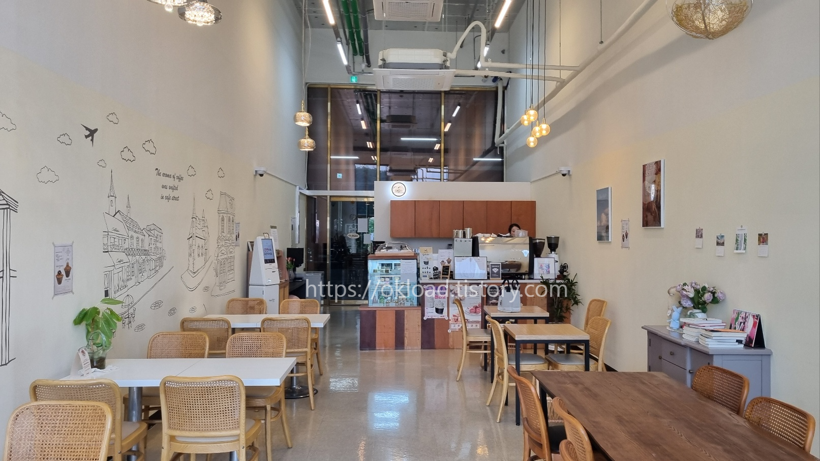 이국적이고 고급스러운 라탄풍의 의자와 원목테이블과 모던한 테이블까지 마치 유럽의 작은 마을의 감성적인 카페를 하나 옮겨놓은 듯한 예쁜 카페다.