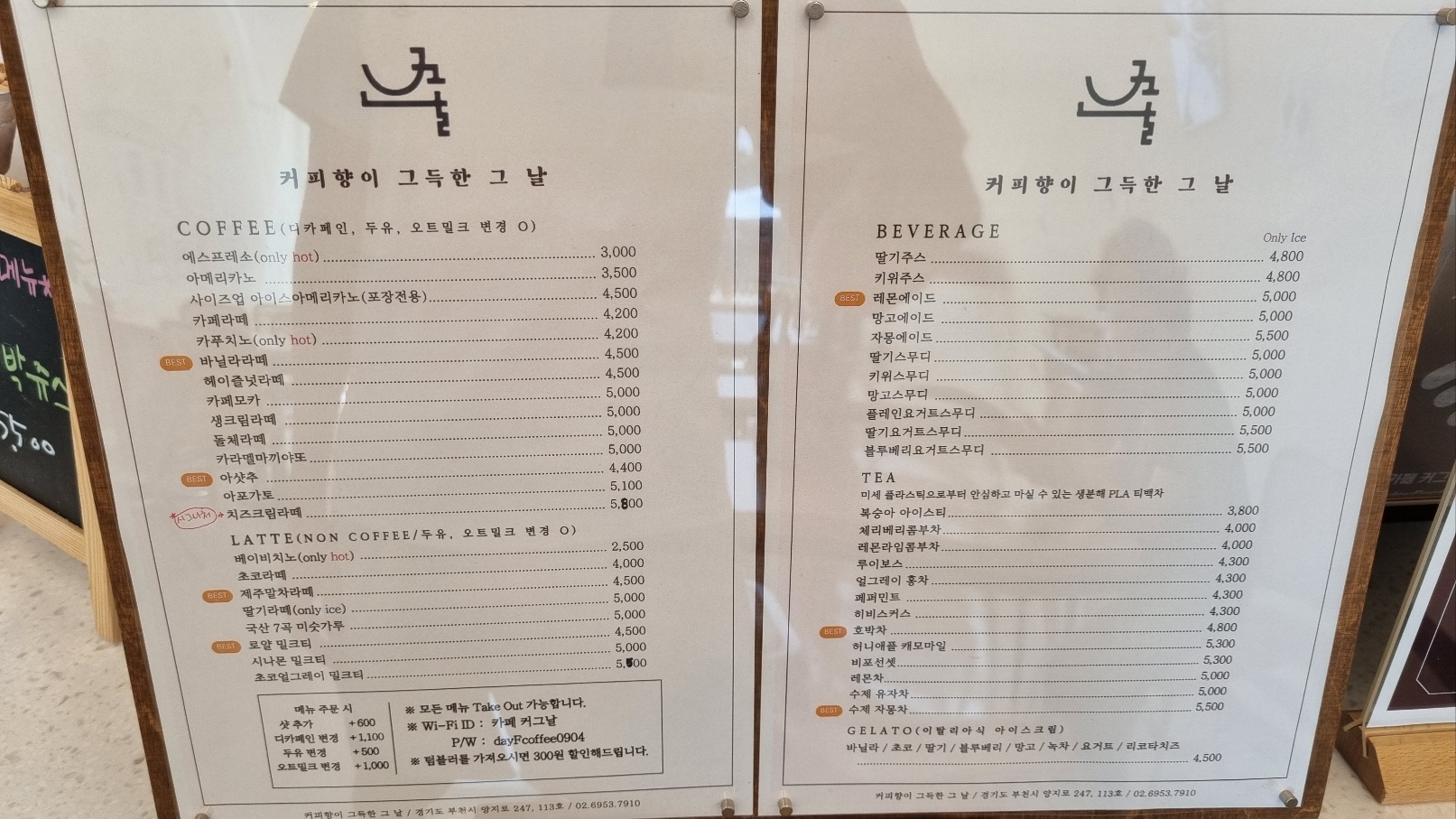 커피 향이 그득한 그날 카페의 메뉴 가격 메뉴판이다.