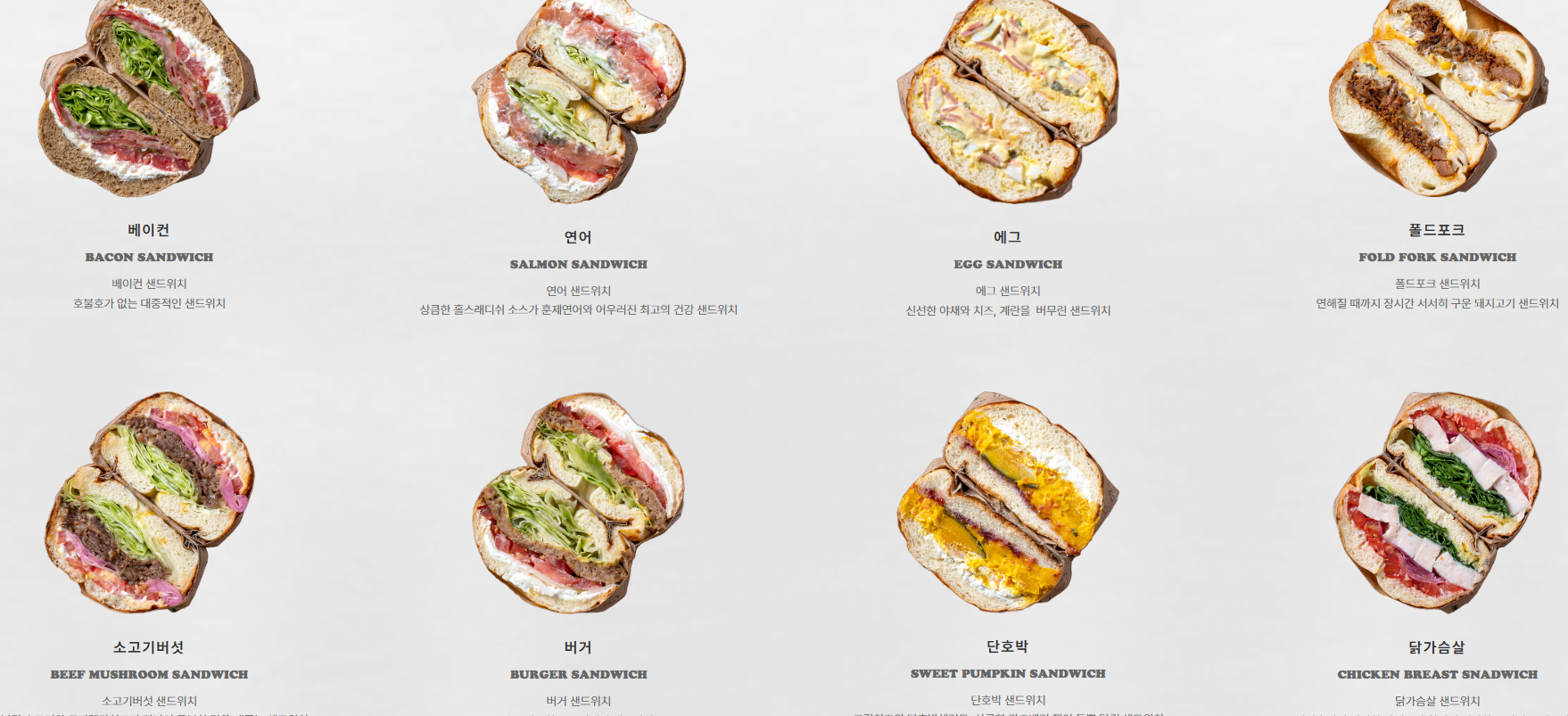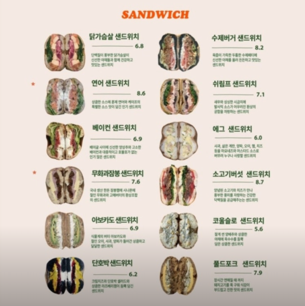 닭가슴살 샌드위치 6,800원 / 수제버거 샌드위치 8,200원 / 에그샌드위치 6,000원 / 베이컨샌드위치 6,900원 / 단호박샌드위치 6,200원 / 코울슬로샌드위치 5,600원 등.