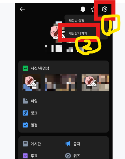 여기서 먼저 1) 오른쪽 상단의 '톱니바퀴'그림을 누르면, '채팅방설정'과 '채팅방나가기' 메뉴가 활성화되는데, 여기서 '채팅방 나가기'를 누릅니다!