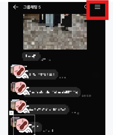 위 화면처럼 조용히 나가고 싶은 단체대화방 대화창 화면에서, 오른쪽 상단의 '三' 모양의 그림을 클릭합니다.