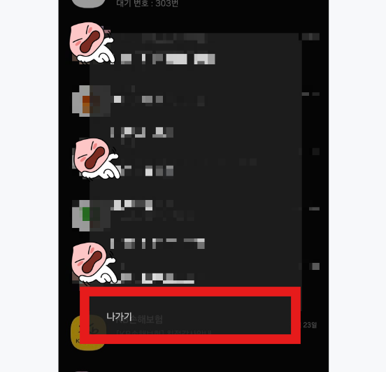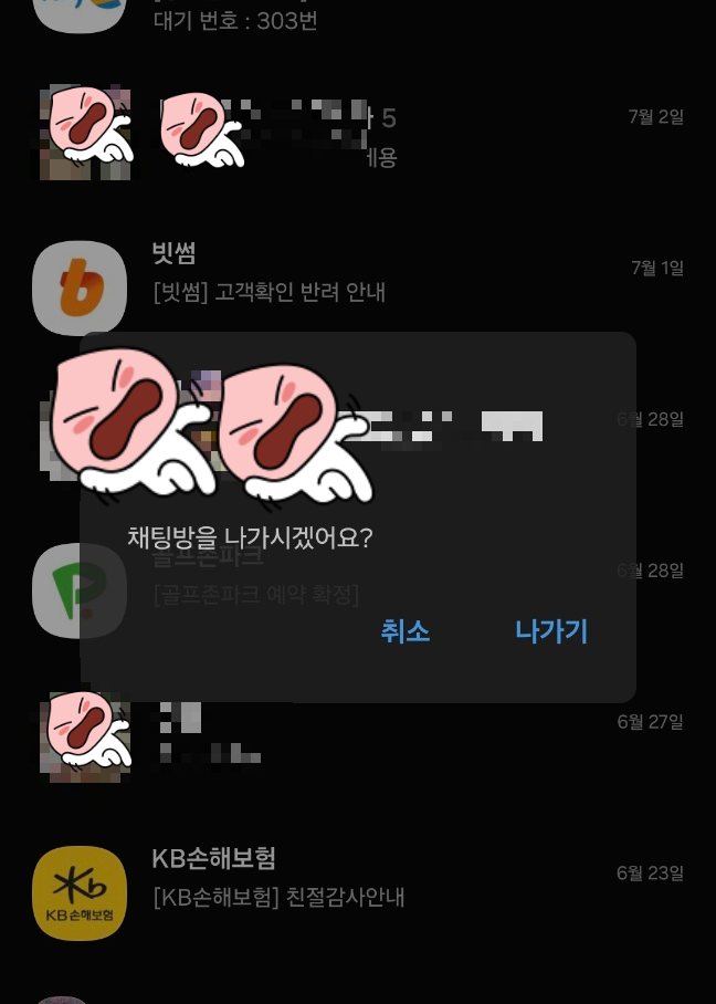 이 '나가기'를 누르면, 아래 화면처럼 '채팅방을 나가시겠어요?'라는 문구만 뜹니다.