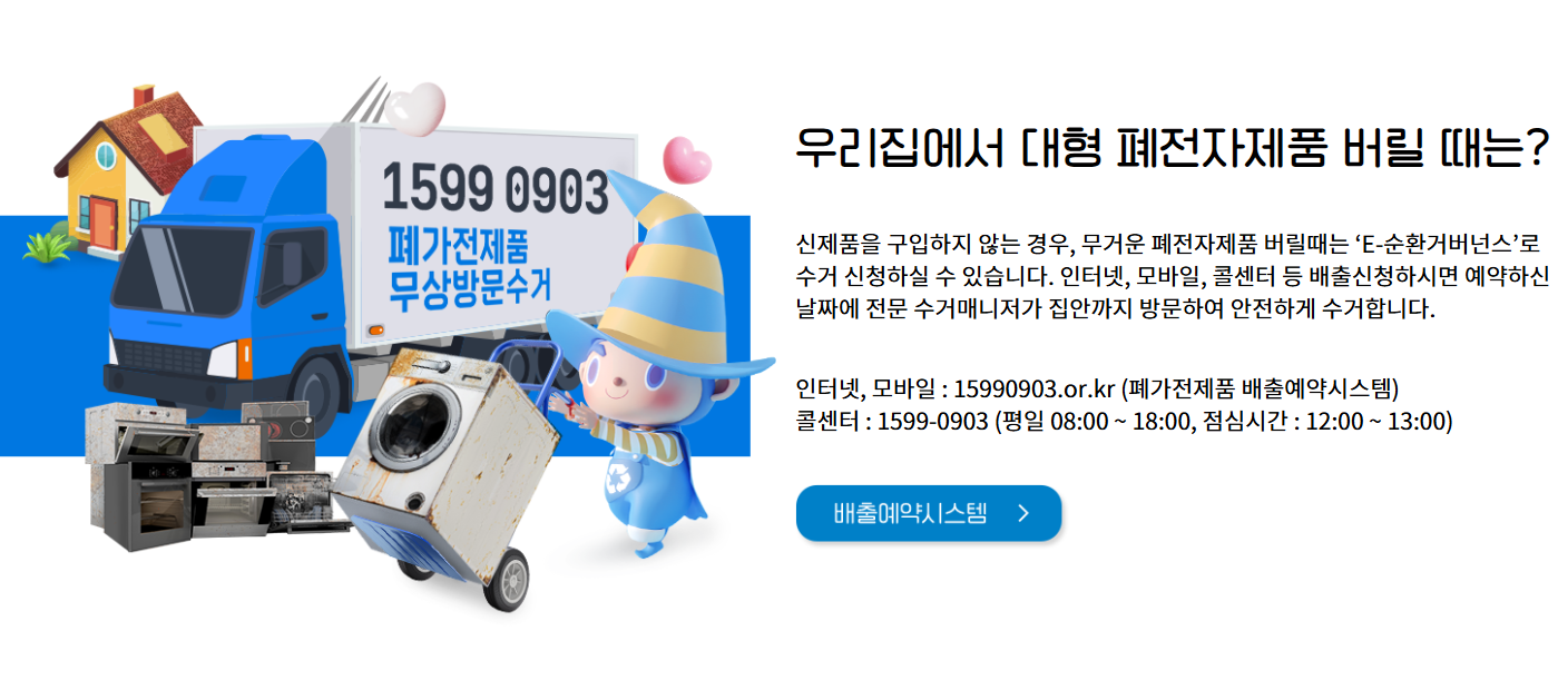 앞으로는, 인터넷 모바일 전화 등으로 간편하게 폐가전제품 무상수거를 신청 예약하여 원하는 날짜에 집까지 방문해서 수거해 주는 'E-순환거버넌스' 무상 폐가전제품 방문수거 서비스를 이용해 보시기를 추천드립니다.