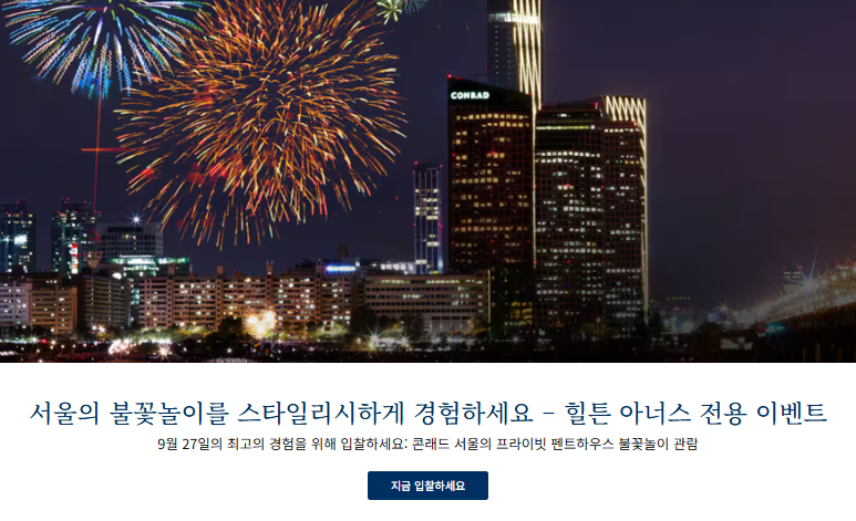 서울 여의도 불꽃놀이 축제를 가장 스타일리시하게 경험할 수 있는 힐튼 아너스 전용 이벤트 '여의도콘래드 불꽃놀이 전용 프라이빗 펜트하우드 예약'입니다.