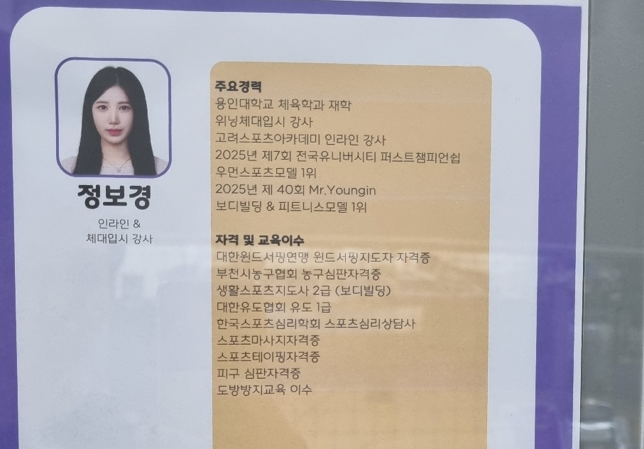 정보경 체대입시 강사님인데, 가장 눈에 들어오는 프로필 경력이 '전국유니버시티 퍼스트챔피언쉽 우먼스포츠모델 1위' / '보디빌딩 피트니스모델 1위'!!
