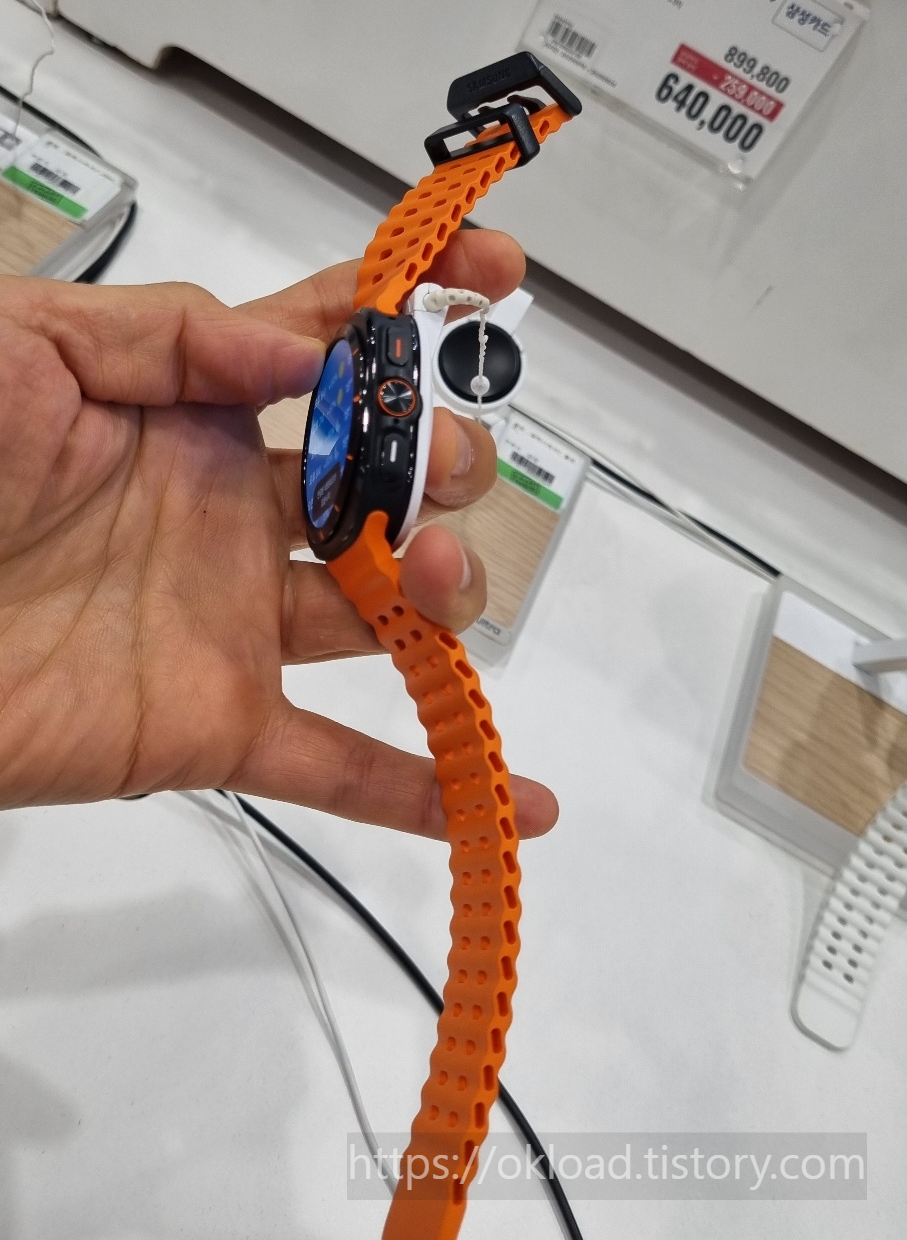 마트 한켠에 마련된 삼성전자 진열대에서 발견한 오렌지컬러 트렙 타입의 갤럭시워치 울트라7을 직접 착용해 보고 착용감과 조작도 해보았습니다.