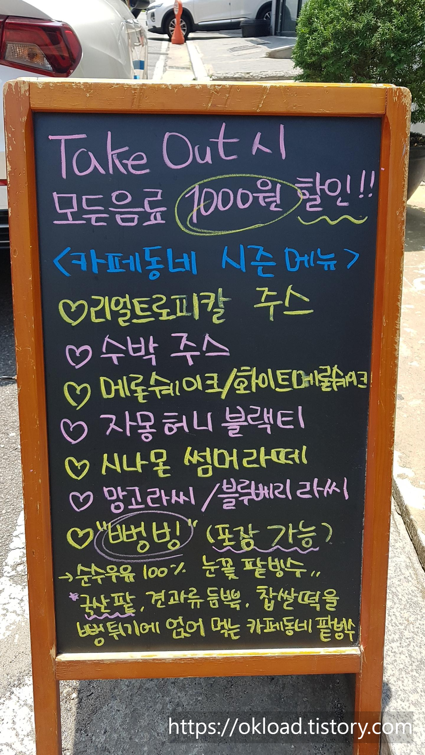 옥길지구 카페동네 출입문 앞에는 여름철 시즌메뉴 메뉴판이 세워져 있다. 무더운 여름에는 팥빙수지! 하며 메뉴를 순수우유 100% 국산 팥을 사용한 뻥튀기 밭빙수(뻥빙)로 정하고 카페 동네에 들어갔다.