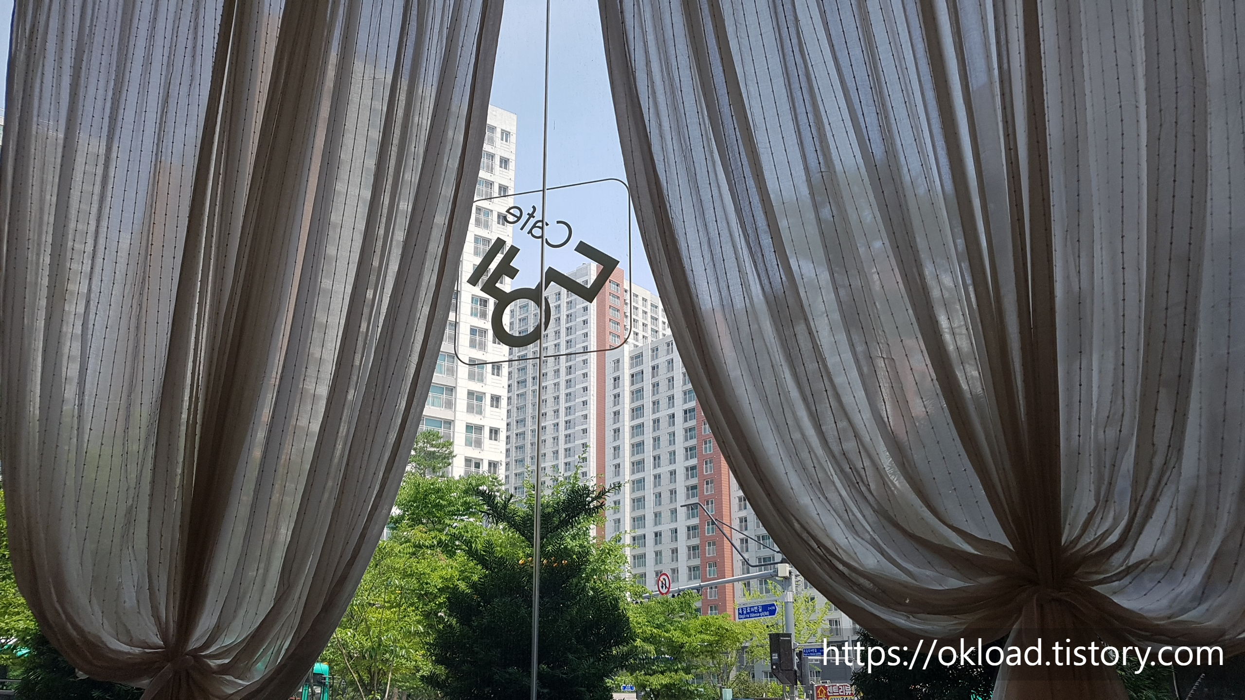 카페동네 옥길점은 유리창이 넓은 통유리로 되어 있어서 채광이 좋다. 그래서 꽤나 큰 커튼을 묶어놔도 전혀 개방감을 해하지 않는다.
