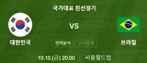 브라질 삼바축구 군단을 한국 서울월드컵경기장에서 맞게 되는 우리 한국 축구국가대표팀은 역대 전전에서 7패 1승으로 매우 열세지만, 과거는 과거일 뿐 새로운 1승을 만들기를 기대해 본다.