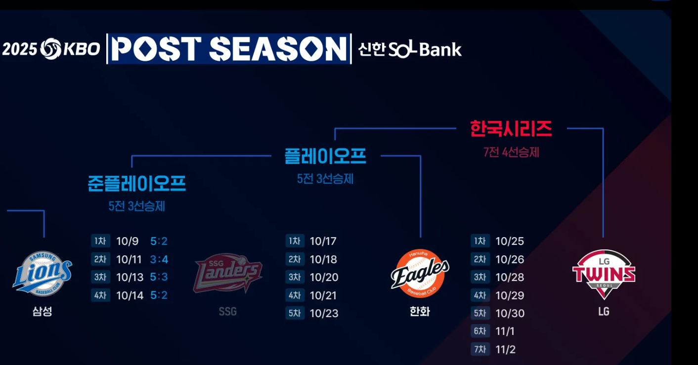 2025 가을야구 포스트시즌 일정과 대진표이다. 이제 플레이오프와 한국시리즈만을 남겨놓고 있는 프로야구다.
