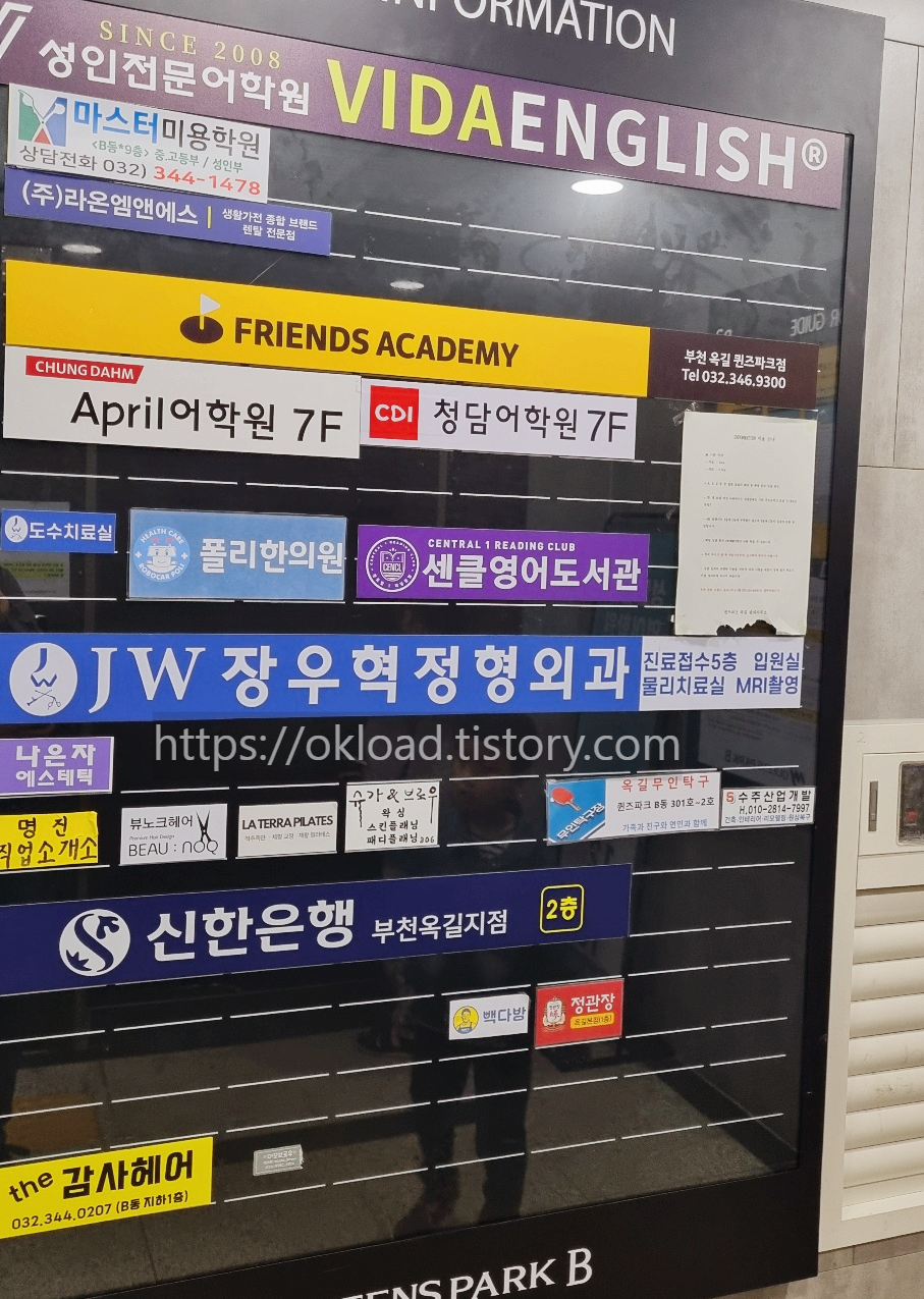 부천 옥길 최대 중심 상권 구역은 퀸즈파크가 있는 곳이다. 옥길동 최대 학원가이자 사업체들이 몰려 있는 문영 퀸즈파크 B동에 입점한 업체들의 층별 현황을 공유한다.