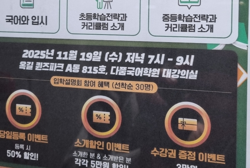 퀸즈파크 A동 8층에 위치한 국어학원으로, 국어와 입시, 초등학습전력과 커리큘럼 소개, 중등학습 커리큘럼 소개 등으로 설명회가 진행된다.
