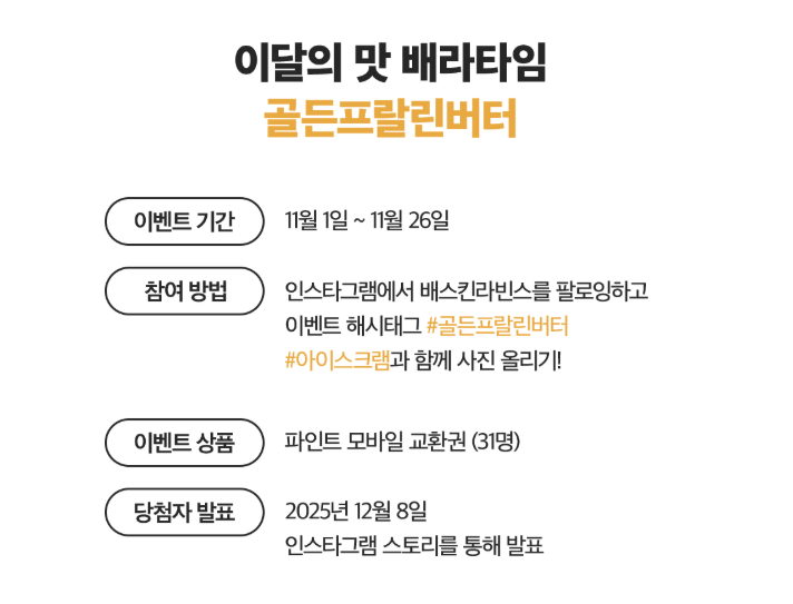 참고로 11월 이달의맛 배라타임 메뉴 아이스크림은 '골든프랄린버터'이다.