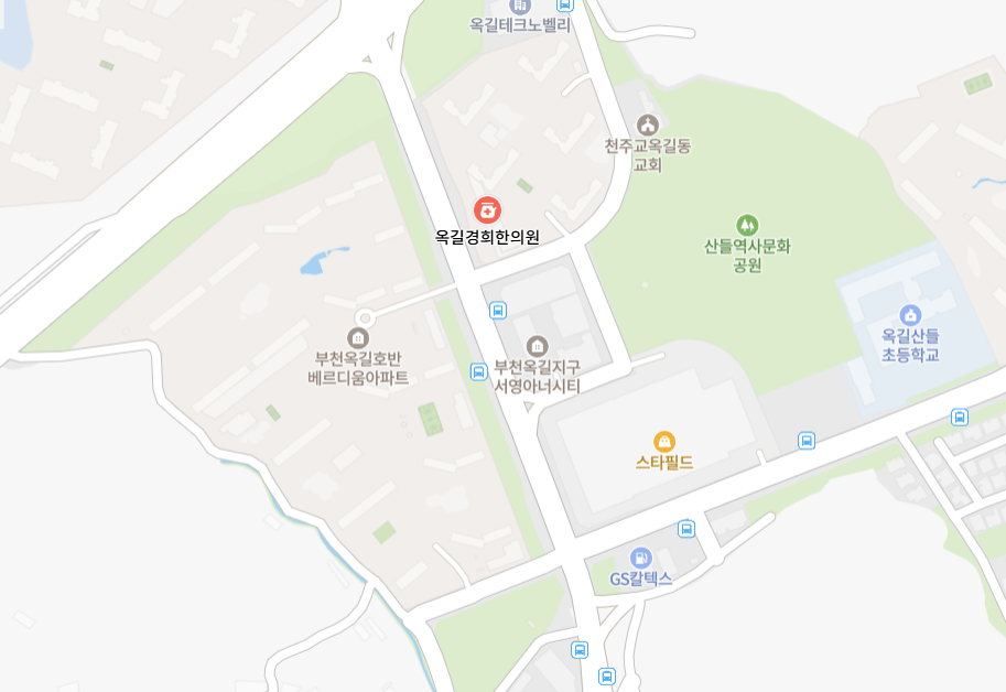 부천 옥길동에는 한의원이 총 6개 있다. 이용현한의원, 따스한한의원, 도유담365한의원, 폴리한의원, 365옥길한의원, 옥길경희한의원.