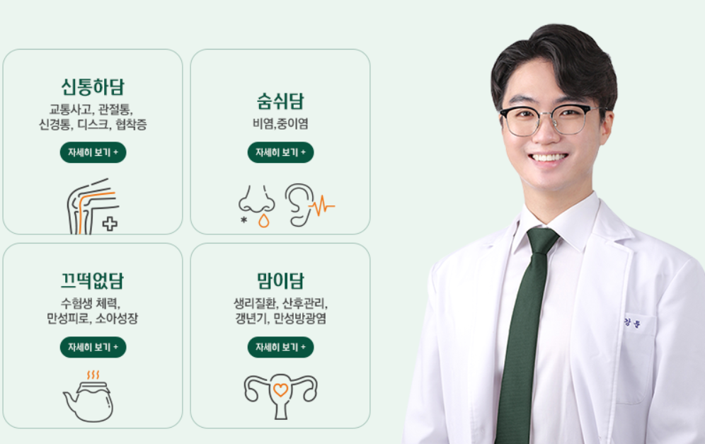 교통사고, 추나, 다이어트, 턱관절교정, 피부안면관리, 어린이 성장 등등 웬만한 진료를 다 가능해 보인다.
