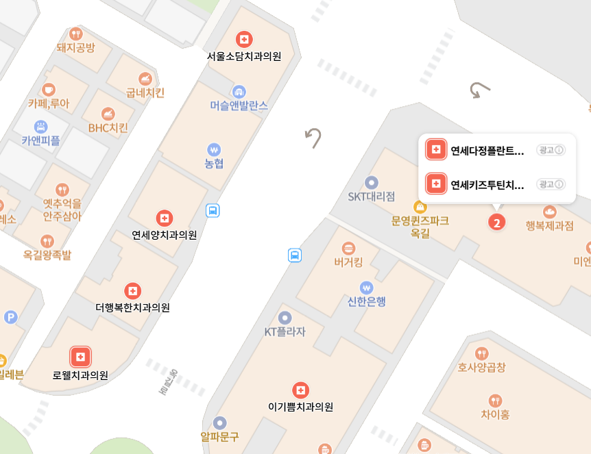 로뤵치과, 이기쁨치과, 더행복한치과, 연세양치과, 소담치과, 연세다정플란트치과, 연세키즈투틴치과, 어스치과.