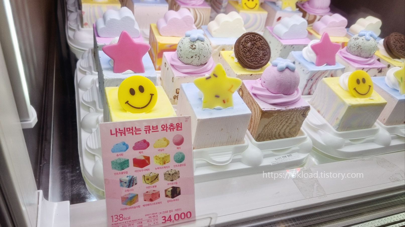 '나눠먹는 큐브 와츄원' 베라 케이크 가격은 34,000원이다. 칼로리는 138kal.