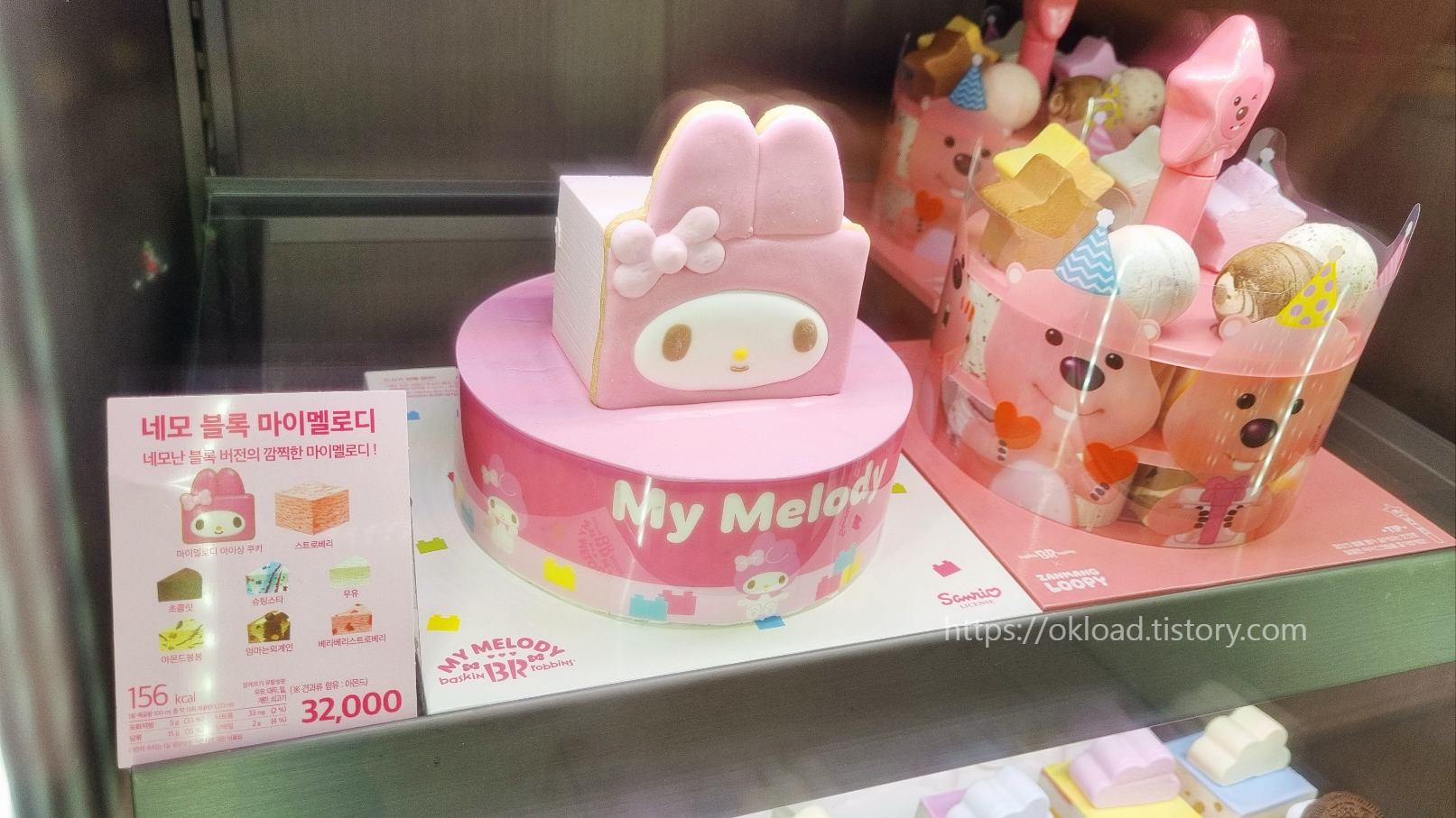 가격 32,000원 / 칼로리 156 kal에 해당하는 베스킨라빈스 아이스크림케이크 '네모 블록 마이멜로디' 케익이다.