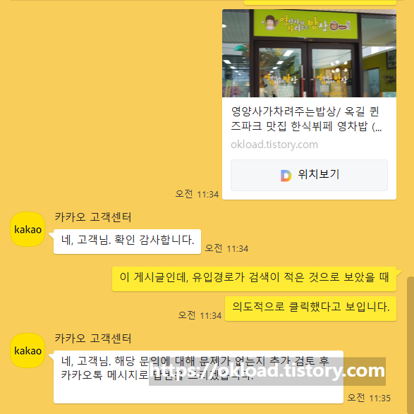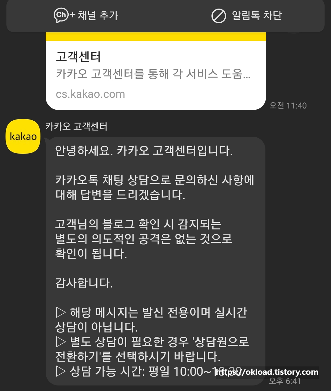 이메일로 지지부진하게 티스토리 피해내역을 알리고, 답장을 기다리고, 부족한 자료를 추가로 보내주면서 시간을 낭비하는 것에 비해 카카오톡 상담신고는 빠르고 쉽고 편리했다. 내가 힘들게 증빙자료를 준비하지 않아도, 문제가 되는 티스토리 주소를 링크로 대화방에 띄우니 바로 고객센터에서 문제가 없는지 검토해 보고 카카오톡 메시지로 답변을 준다고 하였다.
