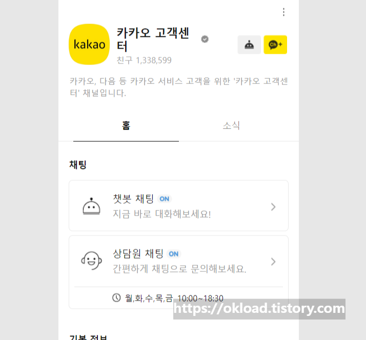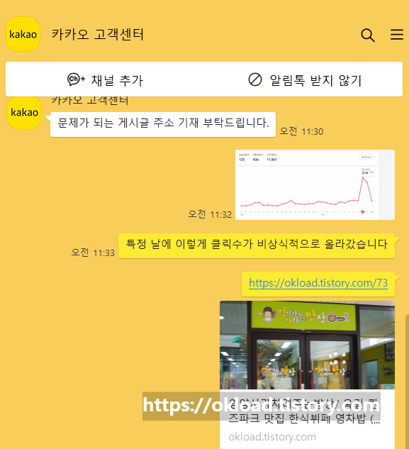 티스토리를 운영하는 카카오에서는 전화상담 서비스는 제공하지 않지만, 카카오톡에서 상담원 채팅을 운영한다. 월~금요일까지 평일에만 운영하며, 10:00~18:30까지 일반적인 전화상담 서비스와 비슷한 시간대에서 채팅서비스를 하고 있다. 실시간으로 상담사와 채팅으로 진행되는 채팅상담이기 때문에 쉽고 편리하고 반복클릭 당한 피해내용에 대하여 설명하고 증명할 수 있는 캡쳐화면서 간편하게 전송해 줄 수 있었다.