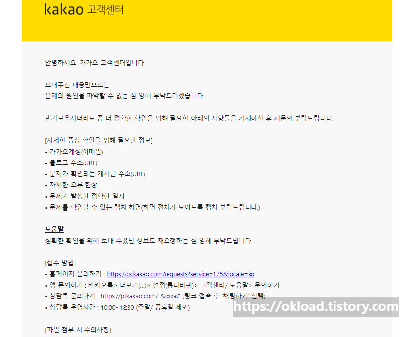 정확한 원인 파악을 위해서 카카오 측에서 요청한 정보는 카카오계정(이메일), 블로그 주소(URL), 문제가 확인되는 게시글 주소(URL), 자세한 오류 현상, 문제가 발생한 정확한 일시, 문제를 확인할 수 있는 캡처 화면(전체가 보이도록 캡쳐)이었다. 피해를 입은 것도 화나고 얼울한데, 이걸 다 신고자 보고 준비해서 증빙하라고??