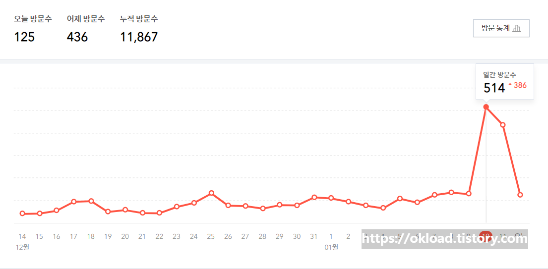 1일 평균 50~100명 정도의 방문수를 기록해 왔었던 내 티스토리(OKLOAD)에 5배 이상이나 되는 방문자 및 조회수를 기록한 것이었다. 처음에는 '드디어 내 포스팅도 한 방 터트렸구나!' 하며 기뻐하였으나, 방문자 통계 관리메뉴에 들어가서 분석해 보니, 부자연스러운 반복클릭이 행해졌다고 판단되었다.
