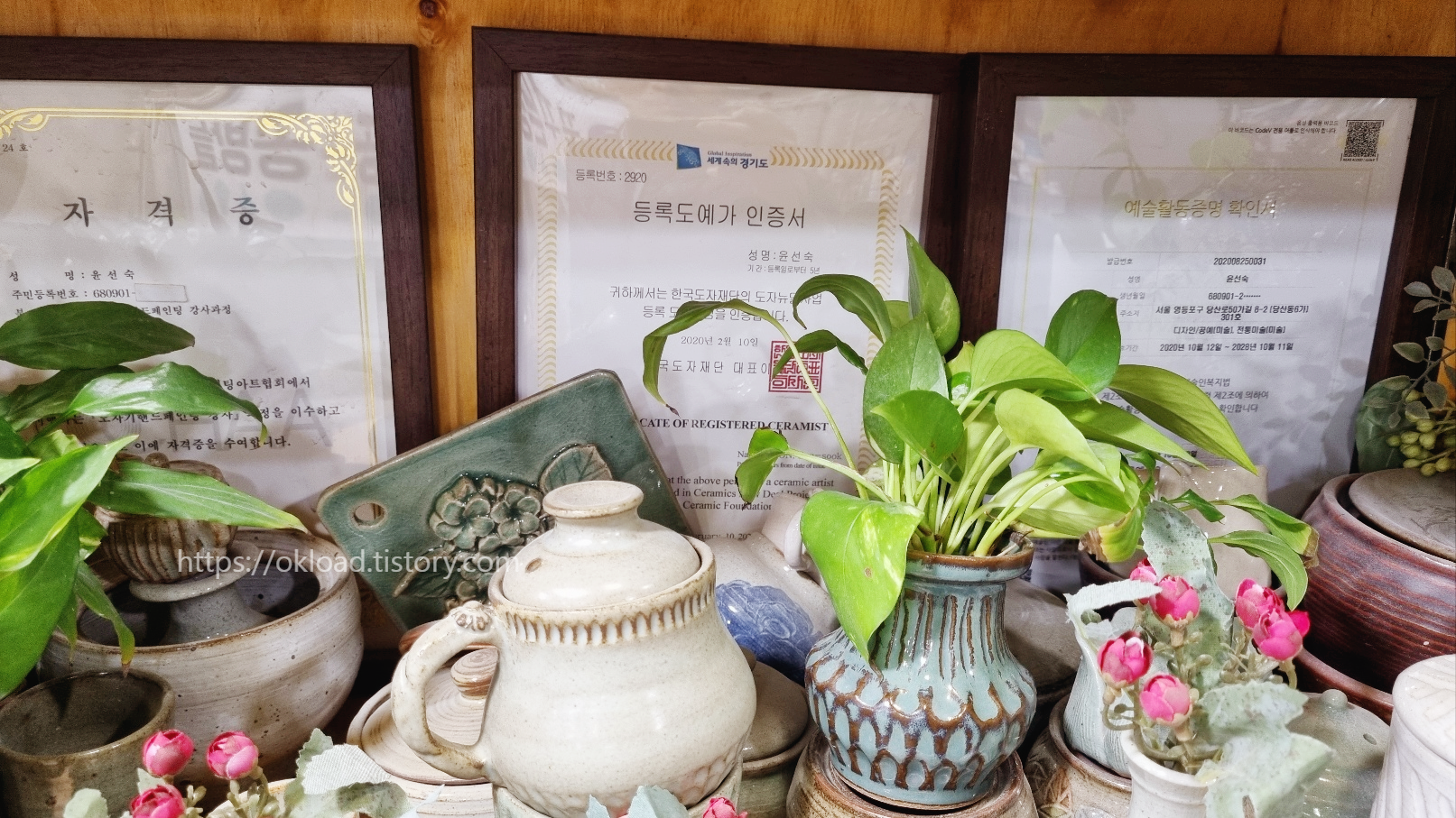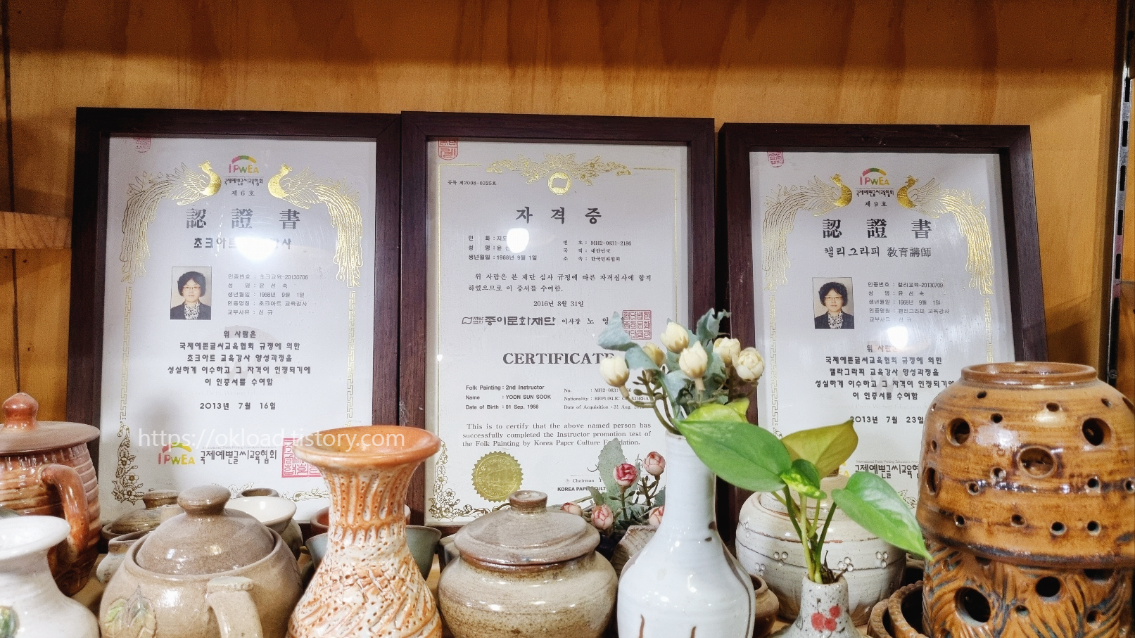 부천 옥길 도자기공방 원장님의 자격증이다. 민화, 도자기, 그림 등등 재주가 많으시다.