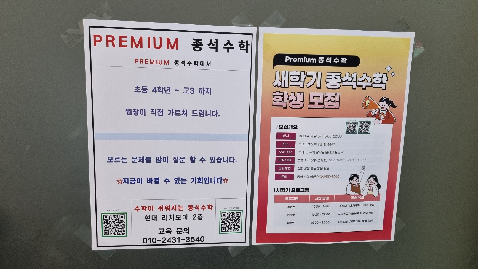 프리미엄 종석수학 초등 4학년부터 고등학교 3학년까지 원장이 직접 가르치는 범박수학학원이다.