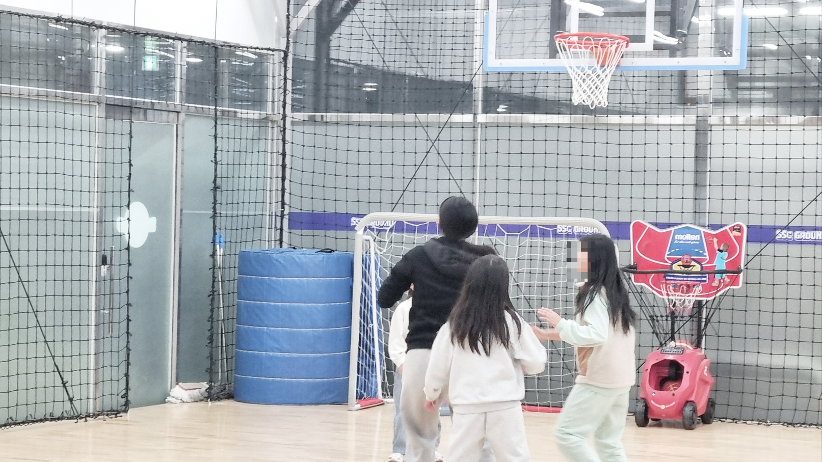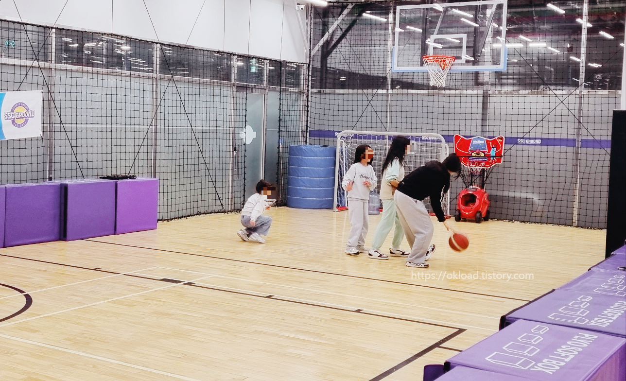 예상보다 일찍 도착하여 유치부 축구수업 전의 초등 농구교실 수업을 구경하였다.