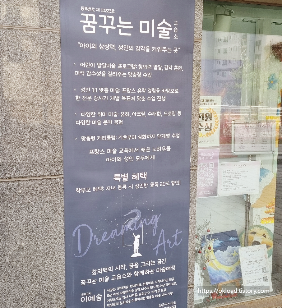 꿈꾸는미술학원은 한양수자인에듀힐즈아파트 1층 상가에 입점해 있다.