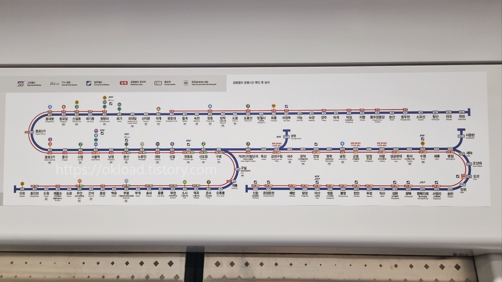 위 사진을 확대하면, 더욱 자세하게 1호선 전체 노선도 노선표를 확인할 수 있다. 1호선 급행 정차역과 환승역도 함께 확인 가능하다.
