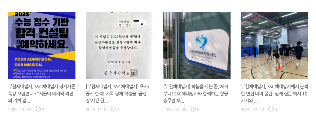 해당 체대입시 학원 홈페이지에 방문해 보니 실제 사관학교에 합격한 학생 2명이 받은 합격증을 게시하였습니다.
