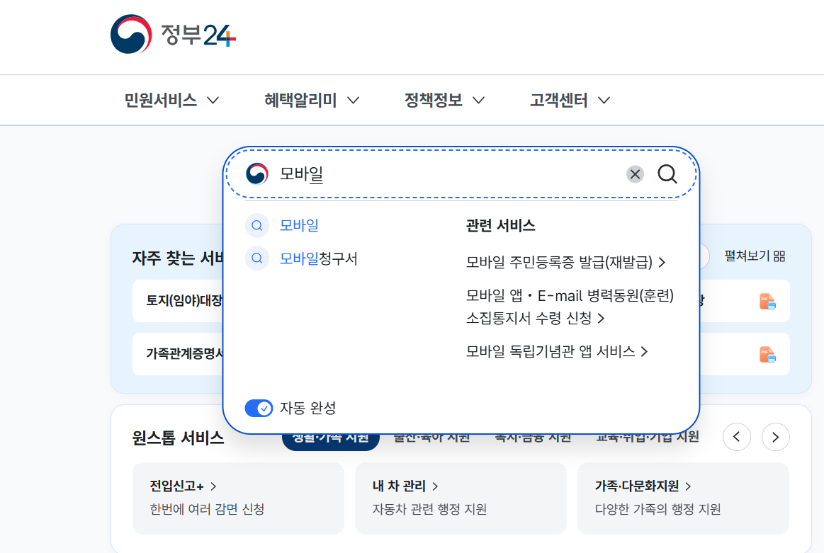 정부24 사이트에 들어가서 관련서비스 검색창에 '모바일 주민등록증 발급'을 입력하니 연관어가 뜬다.