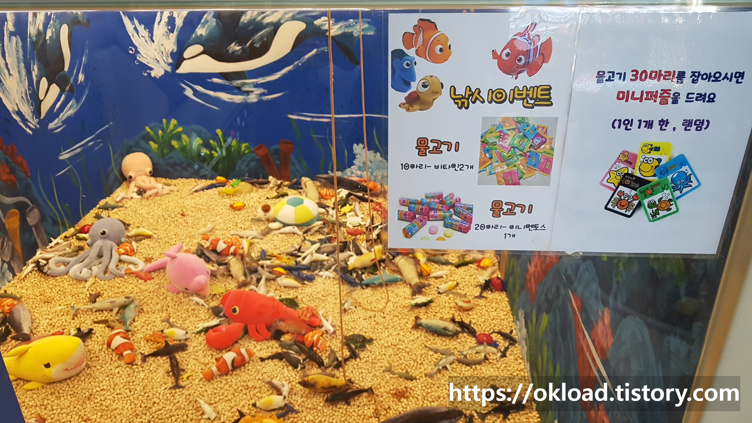 아이가 많은 시간을 할애하는 코너 중 하나인 낚시놀이 장소다. 10마리를 잡으면 비타민, 20마리는 멘토스, 30마리는 퍼즐을 선물로 받을 수 있다. 자석으로 물고기를 낚는 방식인데, 제법 손맛을 느낄 수 있는 낚시게임이다.
