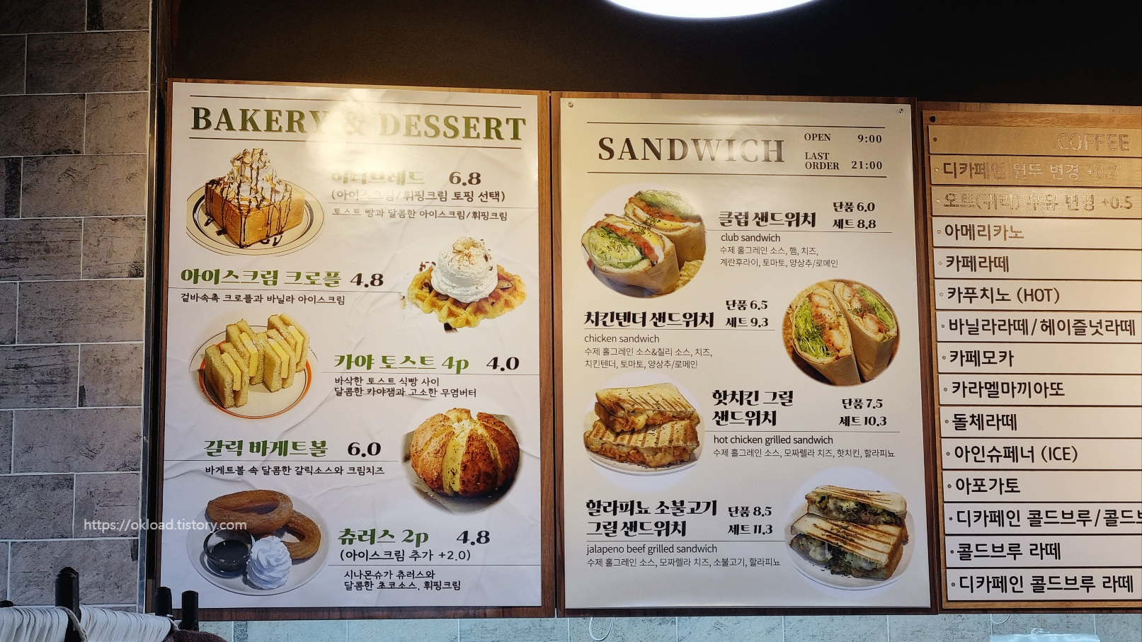 아메리카노, 라떼, 아인슈페너 등 커피류 맛 퀄리티는 평균 이상이며, 샌드위치와 생과일주스, 케이크가 맛있다.
