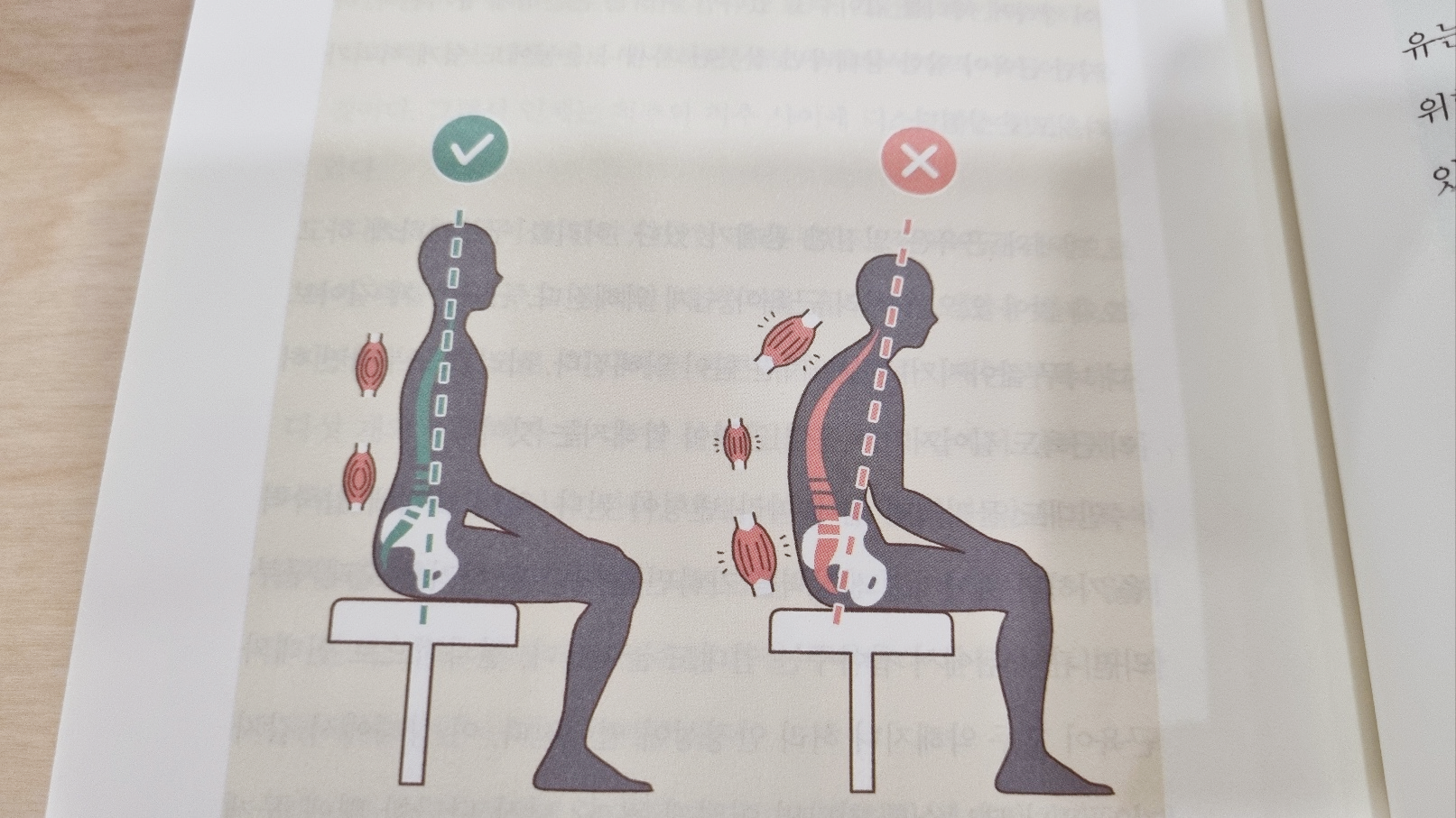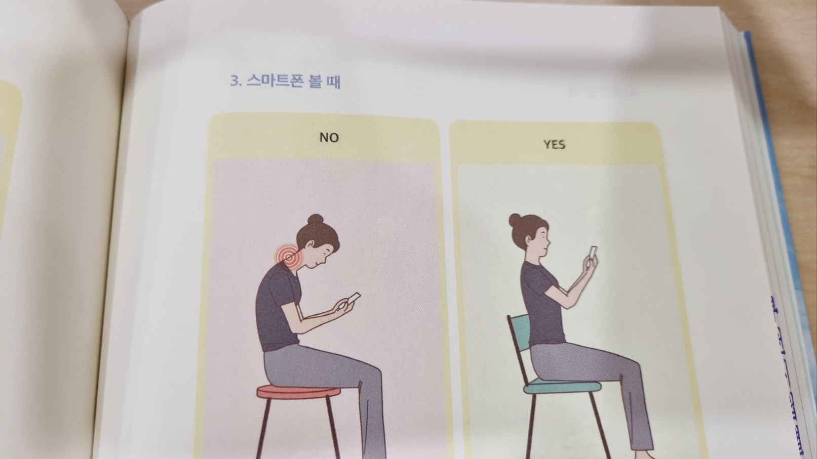 의자에서 스마트폰을 사용할 때에는 위 오른쪽 그림처럼 허리와 목을 일직선으로 곧추세운 상태에서 휴대폰 액정화면은 가급적 멀리 거리를 두고 보자.
