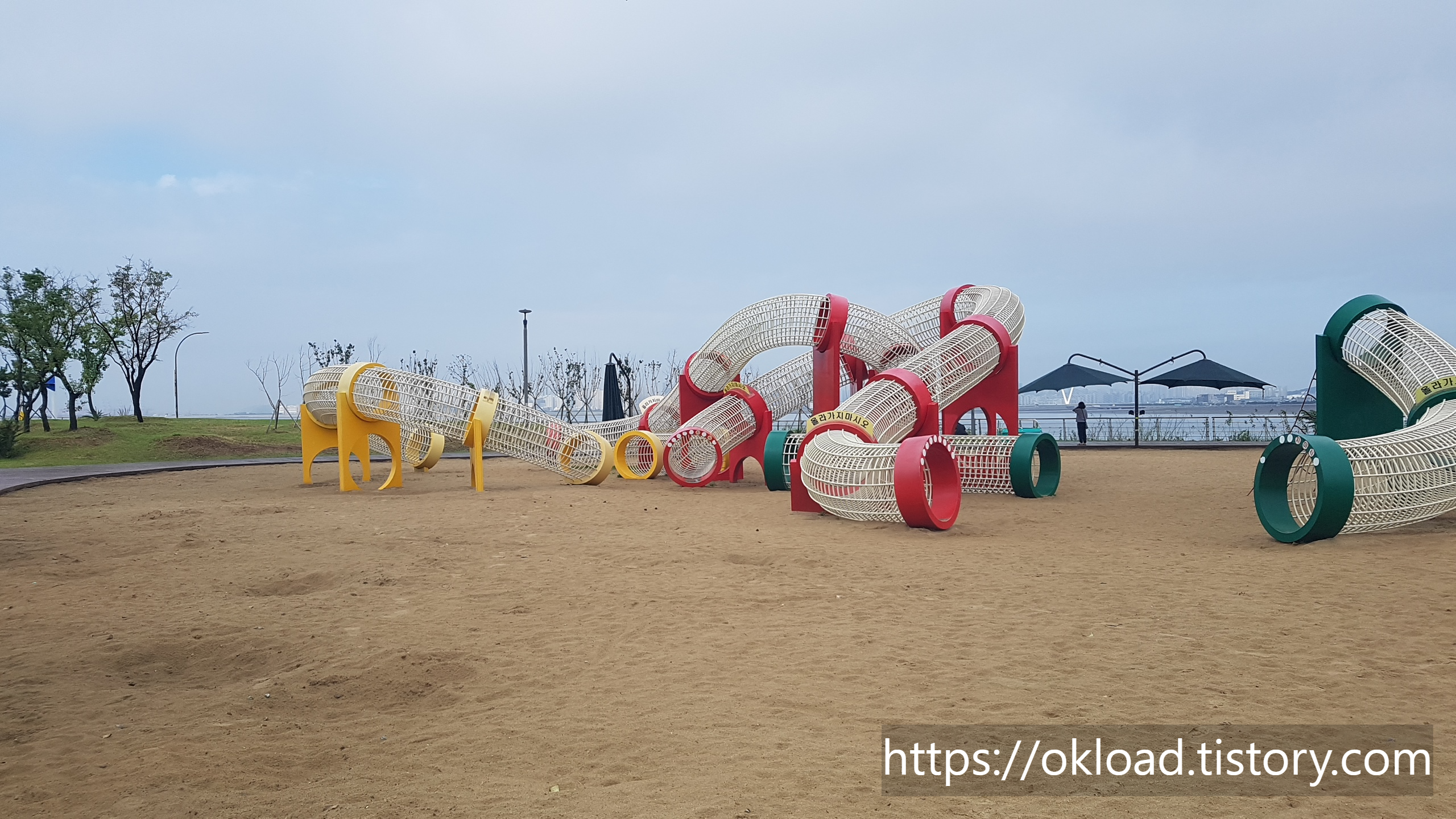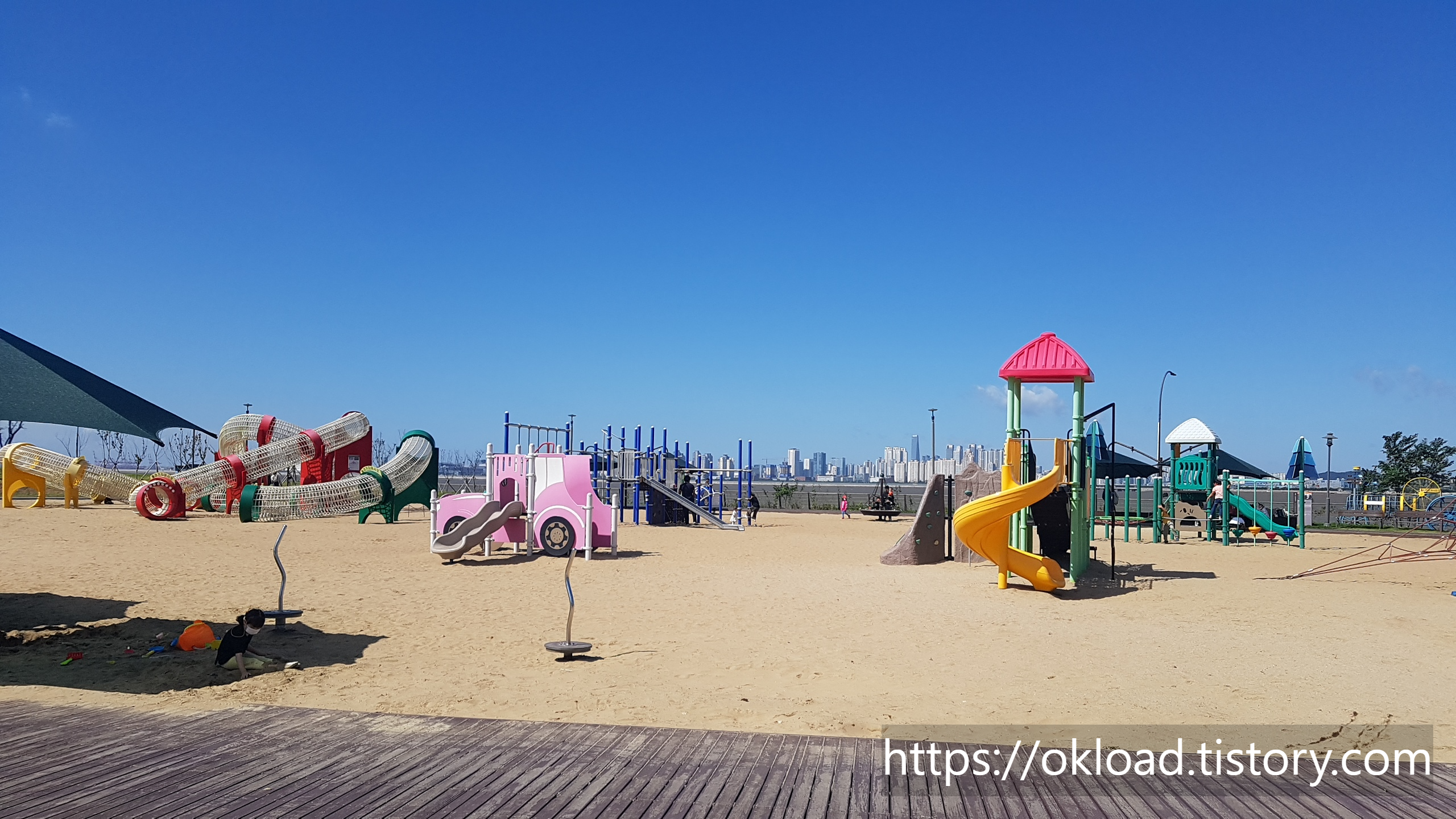 배곧 한울공원의 하이라이트인 모래놀이 야외 대형놀이터다. 1회 촬영으로 모두 담기가 어려울 정도 커다란 규모를 자랑하는 바다가 보이는 놀이터다.