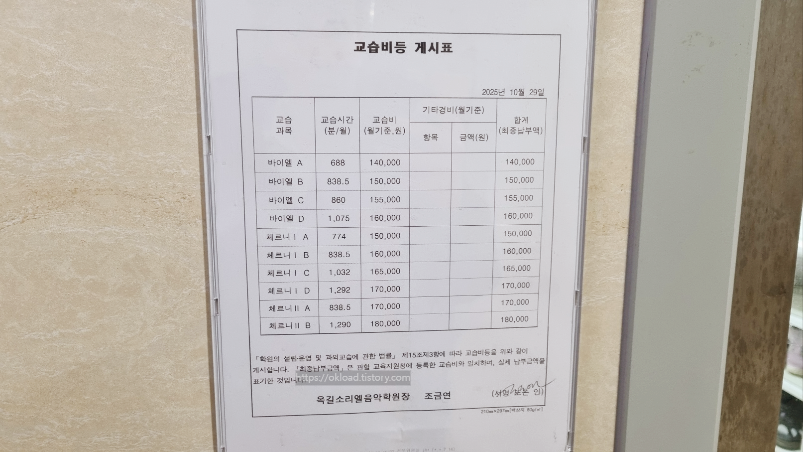 피아노학원 교습비 게시표다.