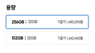 삼성전자 삼성닷컴 홈페이지에서는 Z플립7 가격이 256GB 148만 원, 512GB 164만 원에 판매되고 있다.